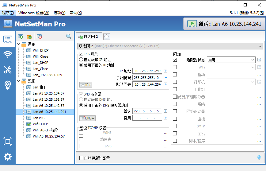 ✔️使用NetSetMan可以预先设置多组参数,预先设置好对应的IP地址、子网掩码、网关地址后。可以快速在预先设置的参数之间进行切换使用。